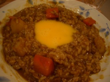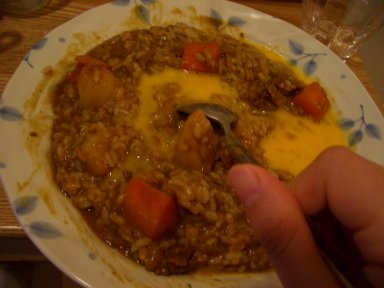 カレーは、混ぜるよりご飯とルーをバランスよくスプーンにとって食べていく方がおいしい。でも、 こうやって こうやって (←溶き卵) こうやって食べるのも好きだ。 あととろけるチーズがけも好きだ要はカレーが好きだ